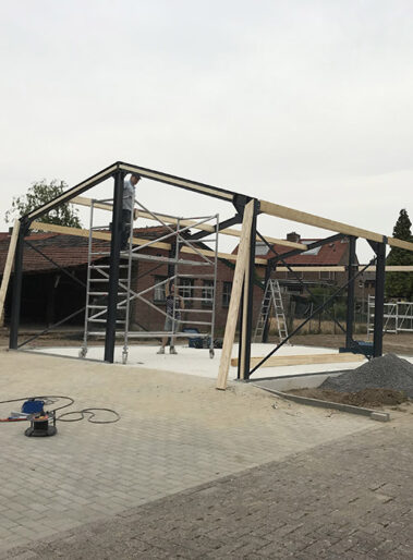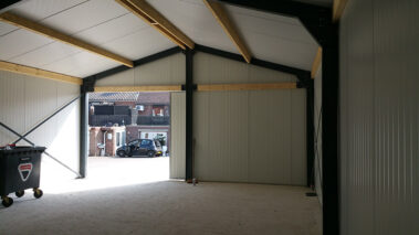 Momenteel waren de diverse goederen in meerdere kleine garageboxen onder gebracht. Na overleg hebben wij deze loods, 7 bij 10 meter, compleet vanaf ontwerp tot montage voor onze opdrachtgever verzorgd. Gebaseerd op de wensen van de opdrachtgever en volgens de geldende regels van de gemeente.