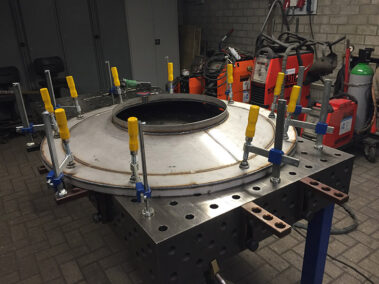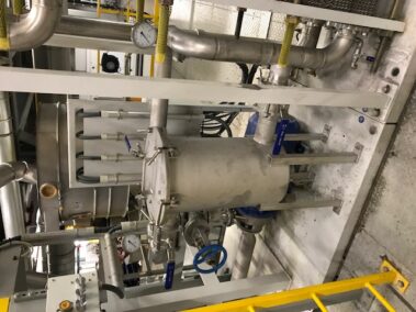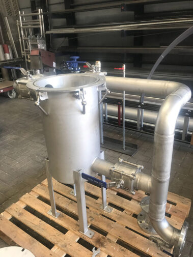 Vaste delen in het koelwater zorgde voor verstopping in de platenkoeler. Men was op zoek naar een oplossing om de vaste delen op te vangen en de mogelijkheid om deze periodiek uit het systeem te kunnen verwijderen. Hiervoor hebben wij een filterpot ontworpen met daarin een emmer vervaardigd uit geperforeerde plaat die als filter fungeert.