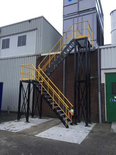 Op het dak van de fabriek bevonden zich ook installaties die regelmatig onderhoud nodig hadden. Voorheen kon men het dak alleen via een kooiladder bereiken. Dit was voor het onderhoudspersoneel een probleem. Materialen en gereedschappen moesten mee worden genomen in de kooiladder of met een touw omhoog worden gehesen. De door ons ontworpen trappentoren bied nu de mogelijkheid om het dak veilig te bereiken.
